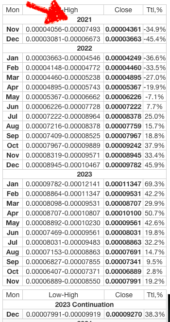 Yukarıdaki grafikten de görüleceği üzere Shiba, 2021 yılı Mayıs ayındaki atağından sonra düşüş trendine girmiştir. Daha sonra Haziran ayında dalgalı bir seyir izlemiştir. Temmuz, Ağustos ve Eylül aylarında ise yatay bir seyir görülmektedir. 2021 yılı Ekim ayında ise Shiba, tüm zamanların rekorunu kırmıştır.